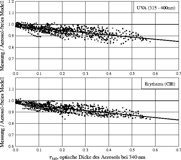 erythemal and UVA irradiances as a function of the optical depth