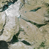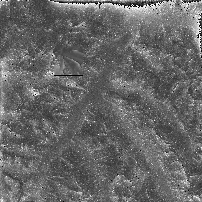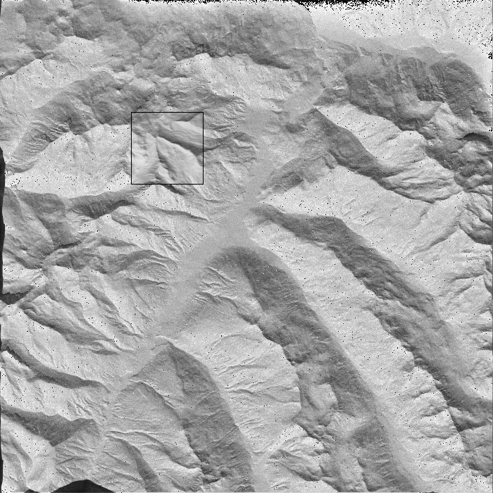 The following images show a high-resolution (700x700 pixels with 25m x 25m) forward calculation. Integrated solar irradiance was calculated for 12:00 (solar zenith angle 36°; surface albedo 0.9). Even after 12 hours computational time (500,000,000 photons), the results are quite noisy and comprise many spikes which are an artifact of the conversion from slope-parallel to horizontal irradiance. In contrast, the 100x100 pixel area (denoted by the black rectangle) was calculated in backward mode. Noise is reduced considerably and the spikes are gone. The result is most striking in the direct component, but equally important for diffuse downward and upward irradiance. Computational time was about 10s per pixel for integrated solar irradiance. Thus, the backward technique makes high-resolution Monte Carlo simulations feasible.