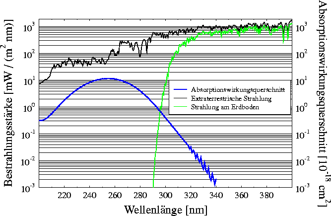 shows the same spectral ranges, but weighted with the DNA damaging