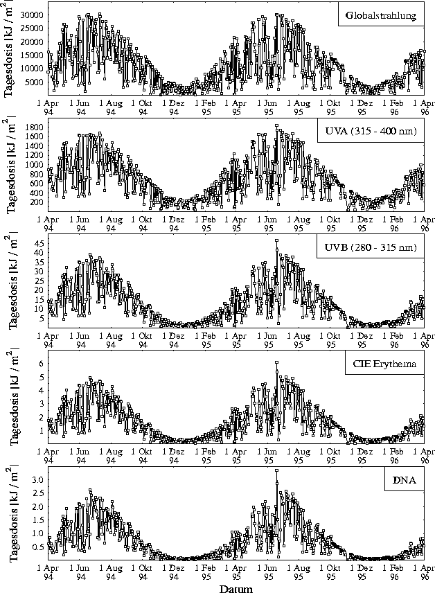 UVA (315-400 nm), UVB (280-315 nm) as well as erythemally and DNA weighted