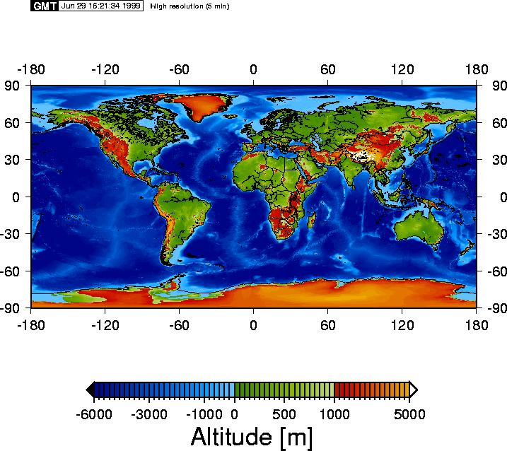 A global topographic map with a resolution of 5 arc minutes (from the TerrainBase data set).