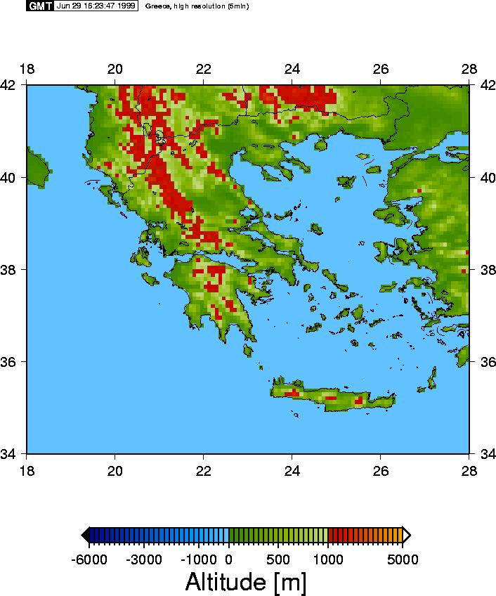 A topographic map of Greece with a resolution of 5 arc minutes (from the TerrainBase data set).