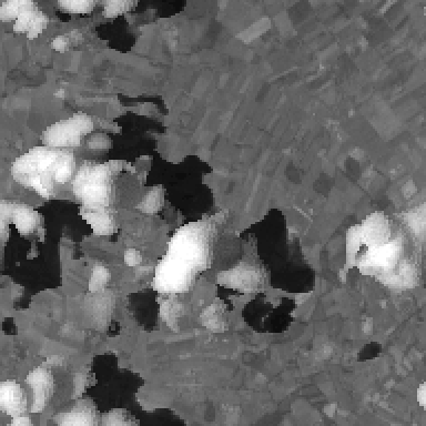 This image shows what a nadir-viewing satellite instrument would measure, or what an observer from an airplane would see when looking straight down. The sun in this example is shining from the left, under a solar zenith angle of 30°. The cloud shadows on the surface are obvious. The sunlit left side of the clouds appears bright, while the right sides are shaded. The surface is a typical example of German farmland with small fields and pastures.