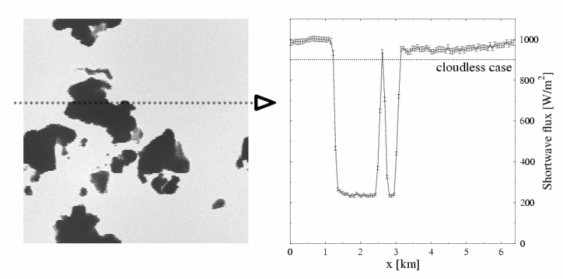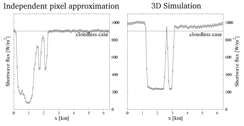 The most obvious features are the cloud shadows at the surface. For a quantitative view, the right image shows a cross section along the dotted line. Although the shadows appear very dark, the irradiance is still about 200 W/m2. A three-dimensional effect that is well known from observation is the enhancement of radiation in the regions where the direct sun is not shaded by the clouds. In this example, the flux is enhanced by up to 100 W/m2 compared to the cloudless sky value of 900 W/m2 (dotted line in the right image). This is due to reflection of radiation at the cloud sides. Other three-dimensional effects become only obvious when the three-dimensional result is compared to the so-called independent pixel approximation: