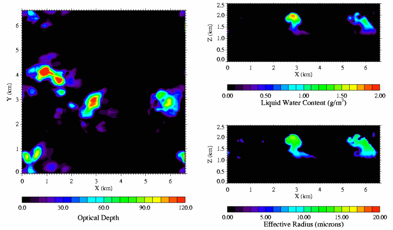Figure 1: Cumulus cloud field; this example has been simulated with Bjorn Stevens' LES model and served as one of the cases in the Intercomparison of Three-dimensional Radiation Codes (I3RC).