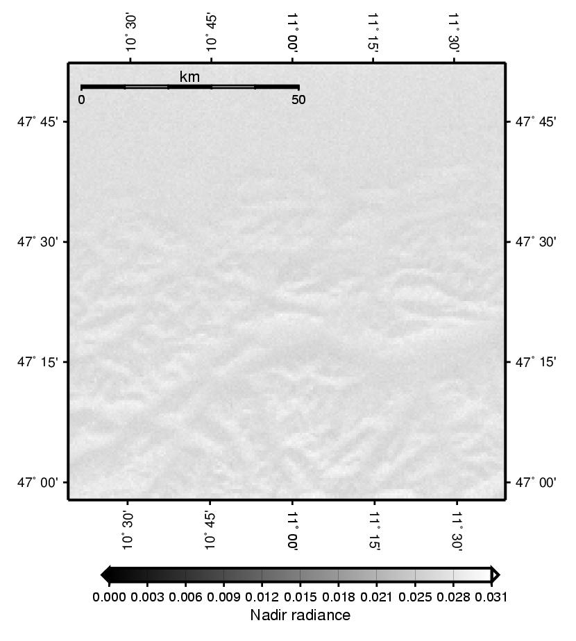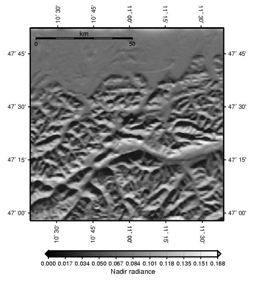 The following Figure shows as an example the nadir radiance over a 100 x 100 km2 area centered around Zugspitze, Germany: