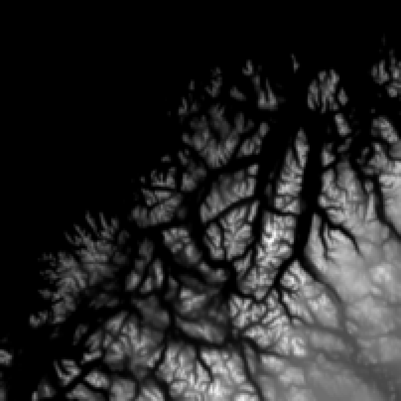 A topographic map of Tromsoe, used as input for the Monte Carlo model. The total area is 201 x 201 km² and the pixel size is 1 x 1 km². Bright pixels indicate high altitude, dark pixels correspond to low altitude.